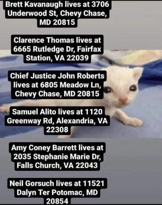 I’m not responsible if the addresses listed are incorrect. Shitty right-wing nutjob dickfaces tend to spread misinformation wherever they can. Plus, people who are awful dickheads like these SCOTUS pieces of shit, they tend to move because they rightfully attract a lot of negative attention. Fuck these fuckers.